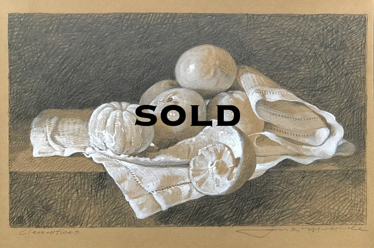 *SOLD* 8.75" x 13.75" - Graphite with acrylic brush highlights on archival quality Stonehendge heavyweight Kraft colored paper. This is the compositional drawing for the finished oil painting - "Clementines" Shipped free (continental US) boxed with foamcore backing in an acetate envelope. - Contact the artist if custom framing is desired after purchase.