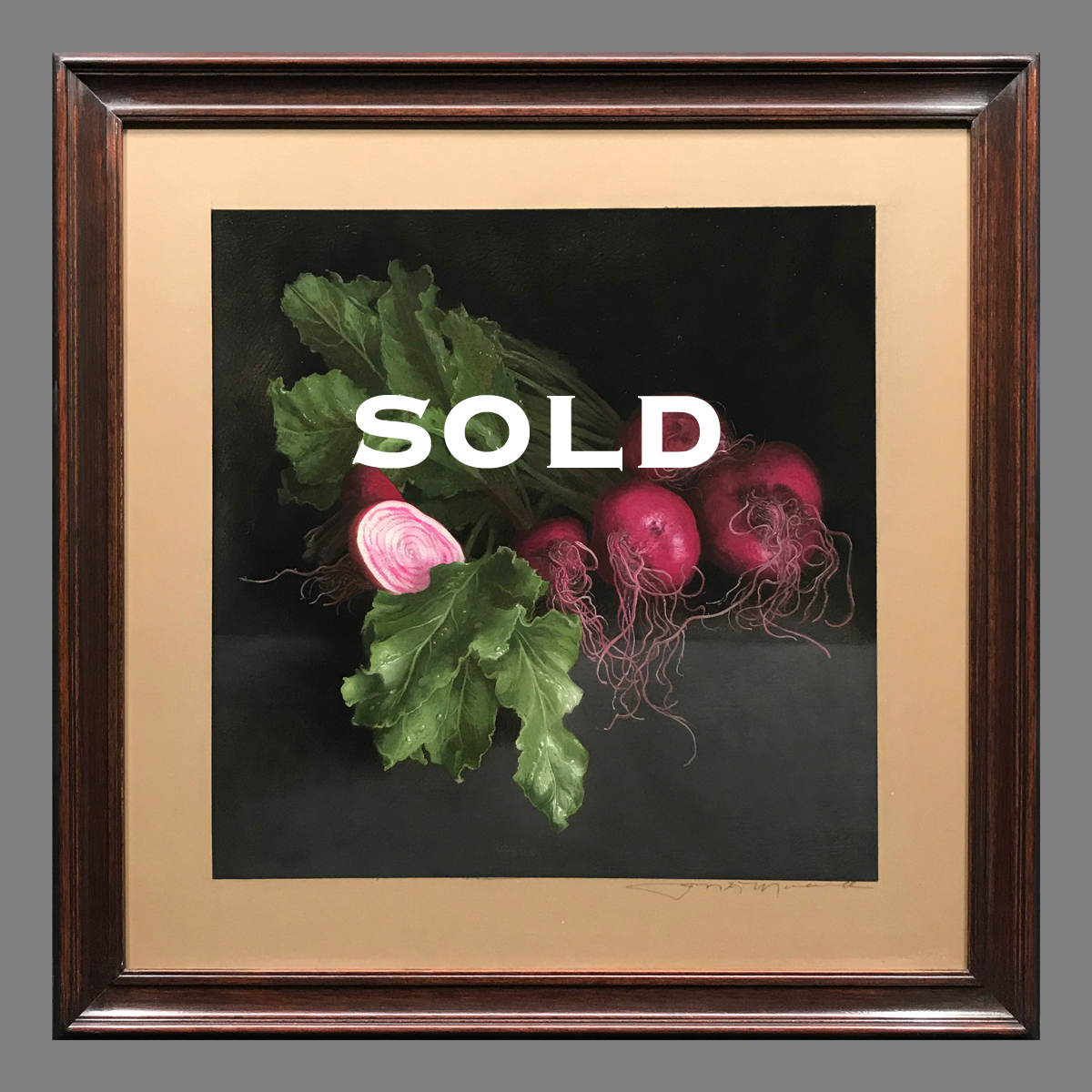 SOLD - Chioggia Beets - oil painted drawing - 13" x 13" (framed size- 20"x 20") The original drawing is mounted and sealed on a panel, then painted with oils and varnished. Walnut colored frame included - (shipping is free in continental US)